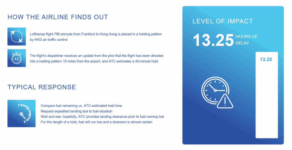 In this scenario, diverting directly to Macau produces a net outcome of just two hours of delay for the flight. This avoids the estimated 13 hours of delay that would otherwise result from a late diversion and longer recovery cycle.
