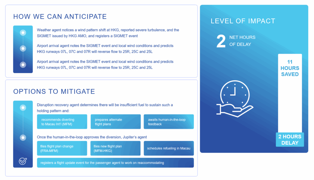 Beyond this one, specific example, the promise of Stratosphere is broader: AI-driven, event-aware, intelligent agents operating across weather monitoring, arrival forecasting, delay prediction, and recovery orchestration, can move airlines from reactive firefighting to proactive disruption management. By detecting signals early, recommending best alternates, preparing flight and ground plans, and integrating a human decision-maker into a rapid approval loop, airlines can realize significant operational efficiencies, cost savings, and improved passenger experience—turning potential chaos into coordinated, predictable outcomes. Simply put, Stratosphere predicts and remedies disruptions to create the most efficient outcome for everyone.